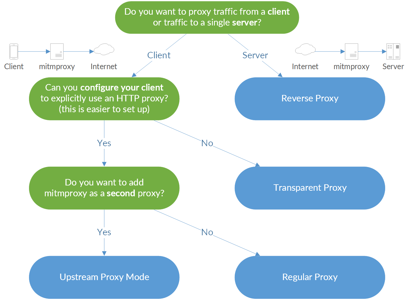 mitmproxy 具有五种工作模式(其实算是是四种,HTTP 代理和 Socks 代理能并为一种:常规代理)